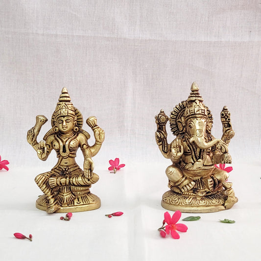 Brass Ganesh & Lakshmi Statue Set – 5” Antique Finish...
