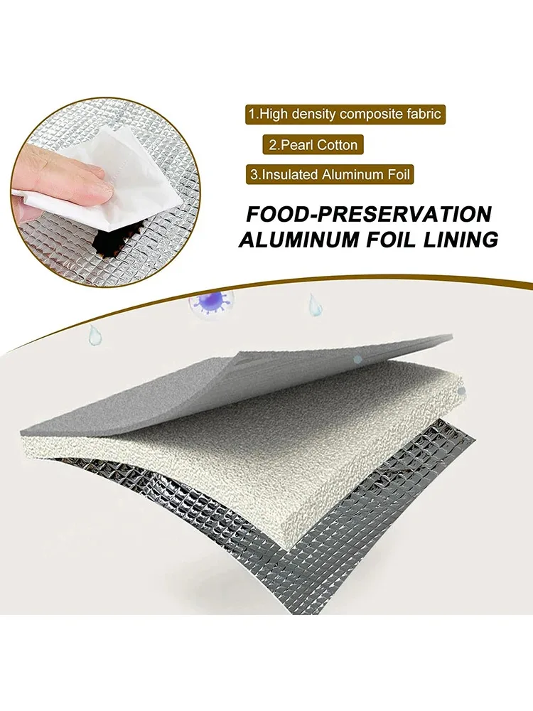 Reusable insulation: This insulated lunch bag is made from a high-density composite canvas fabric.Lined with food-grade safe aluminum foil with excellent insulation and leak-proof properties, this freezable lunch bag keeps your food warm/cold/fresh for hours.Stains on the lining can be wiped with paper towels, saving a lot of time