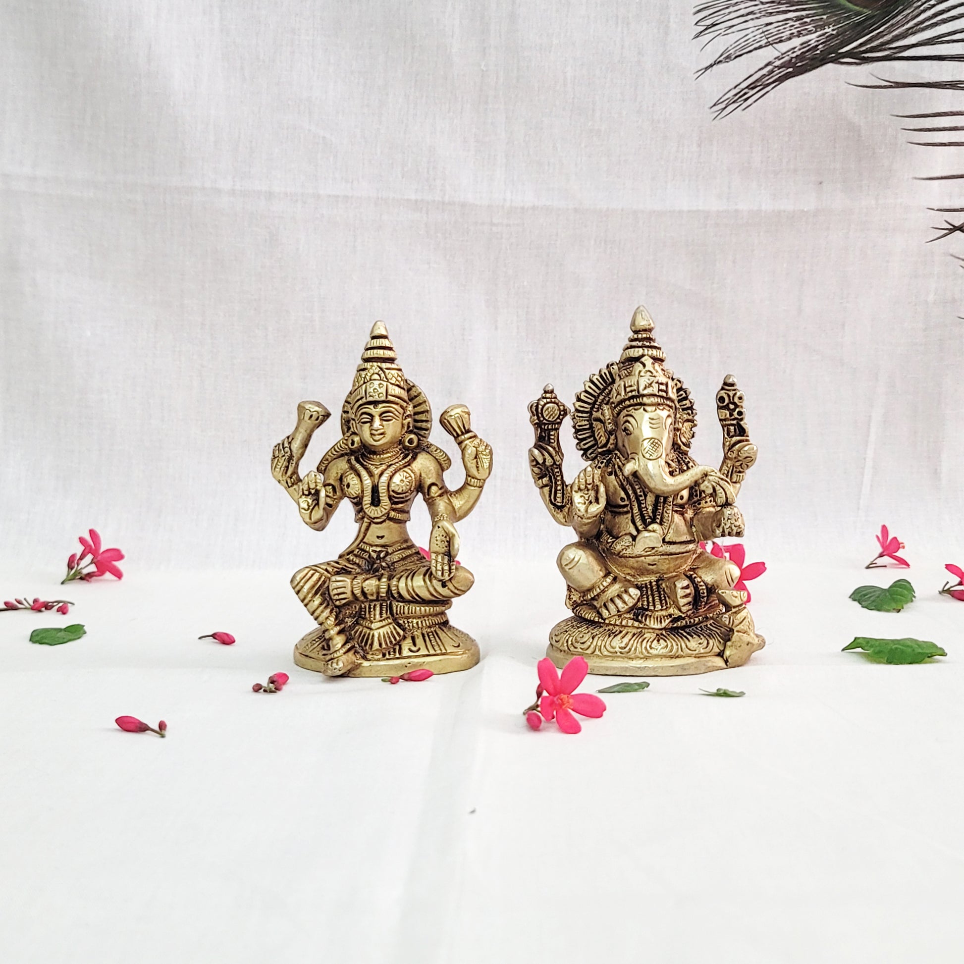 Brass Ganesh & Lakshmi Statue Set – 5” Antique Finish | Handcrafted Home Decor, Festival Display, Auspicious Gifting