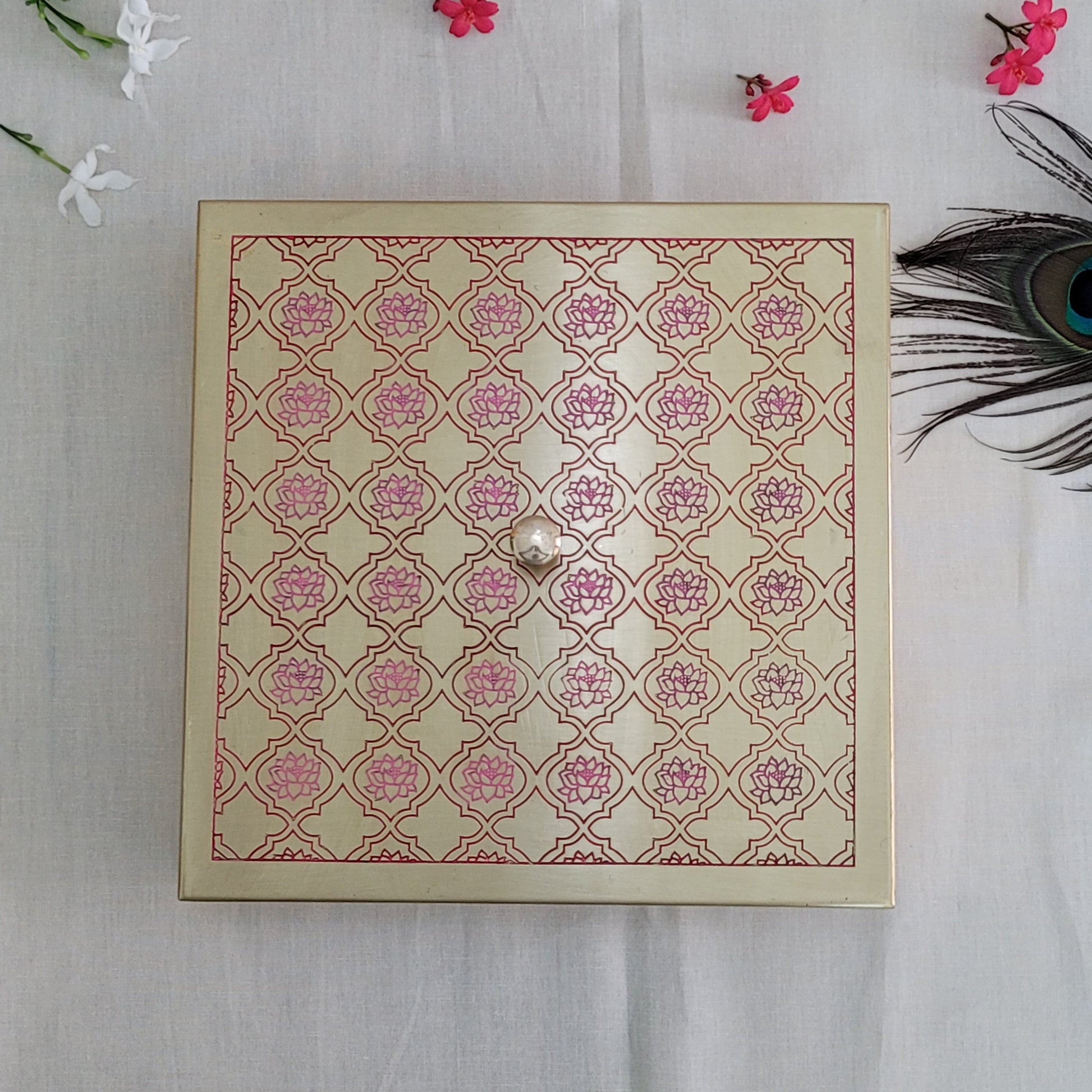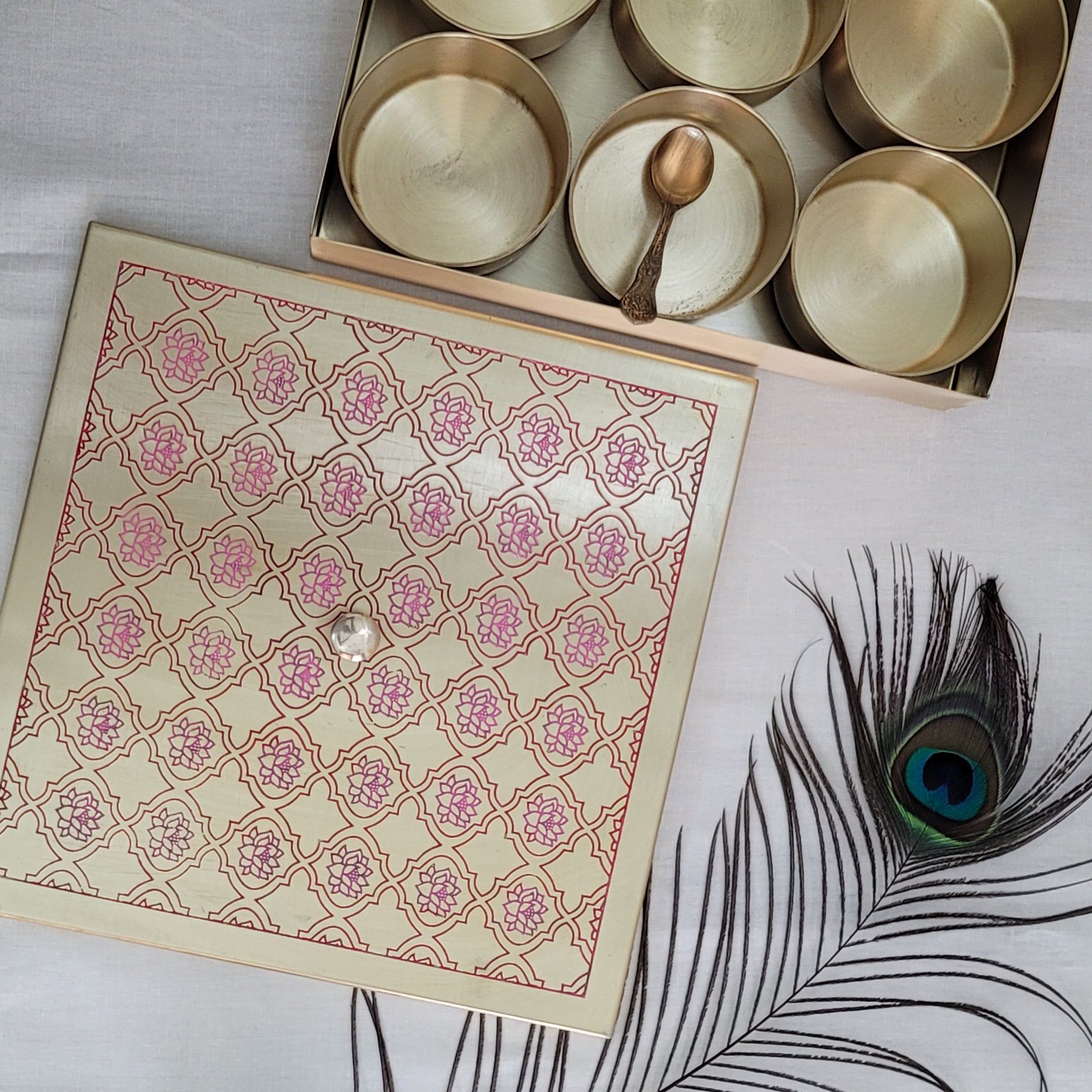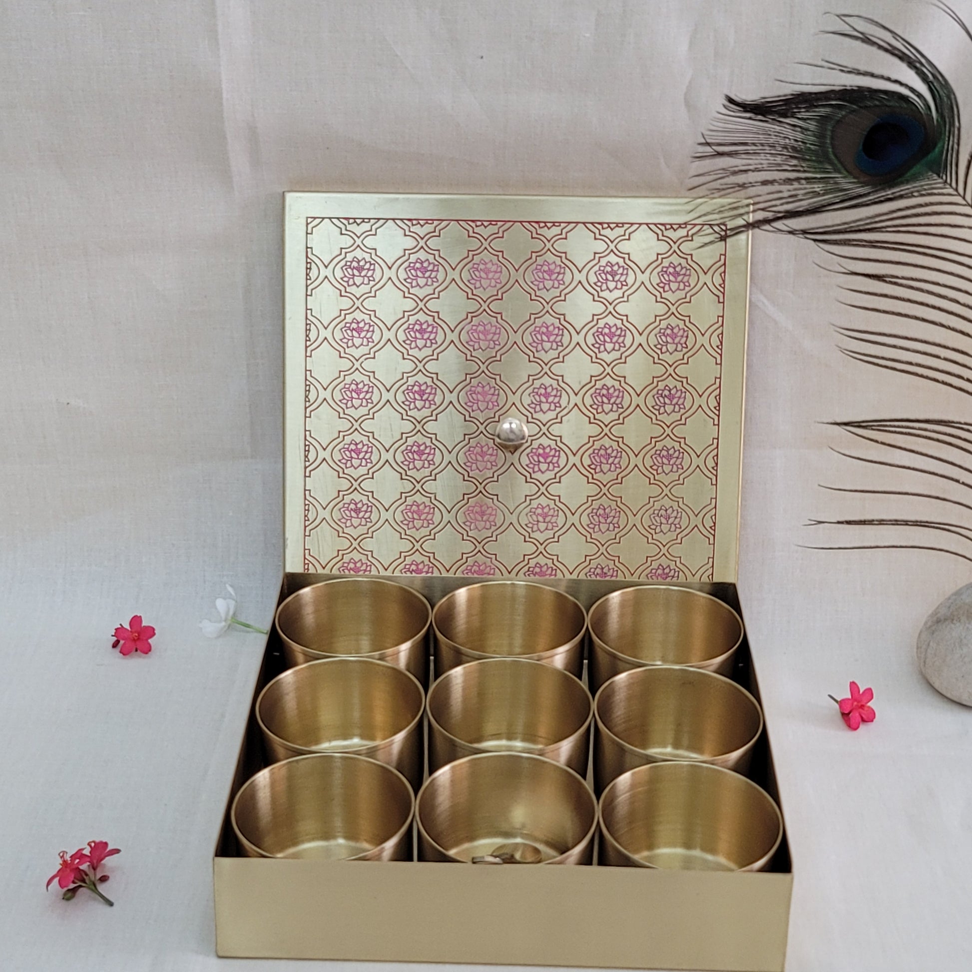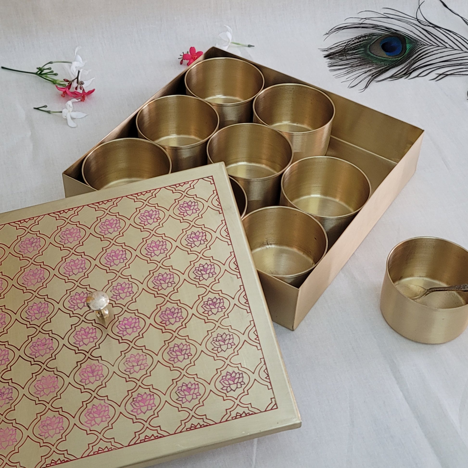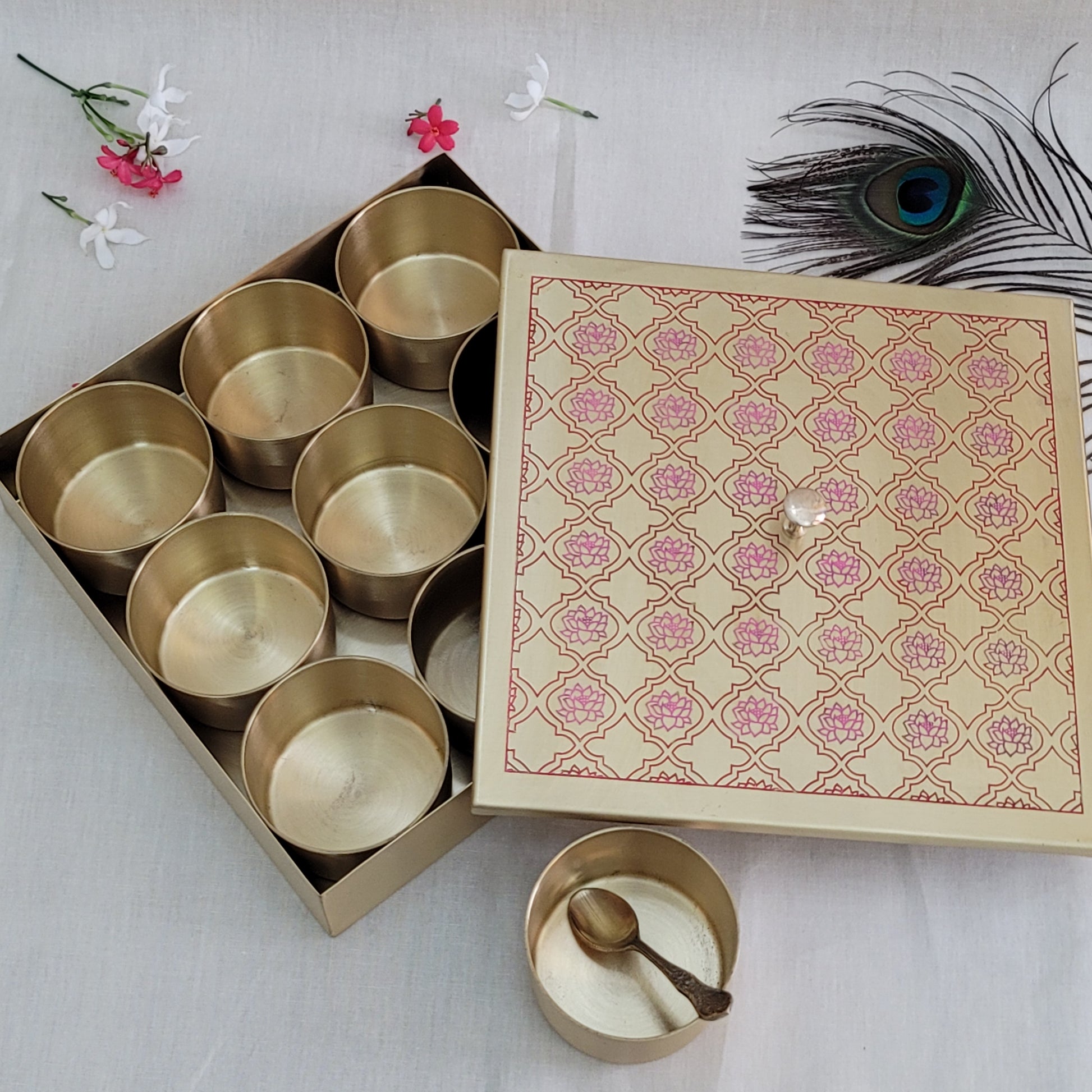 Bring the vibrant spirit of India into your kitchen with our stunning Handmade Brass Etched Square Spice Box Red Lotus design. Comes with 9 Bowls for huge storage for spices.
