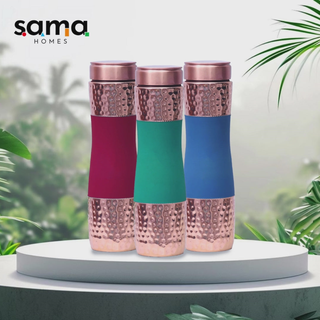 Pure copper hammered silk finish water bottle RGB set of 3 - Red, Green, and Blue Colors for Gifting and Daily use purposes. A beautiful and functional addition to your lifestyle and Sustainable living. Crafted from pure-quality copper, Bottles are hand-hammered to create a unique and elegant textured surface Made from 100% pure copper. The water bottles are both beautiful and functional. The bottles' unique hand-hammered texture adds a touch of elegance to your sustainable lifestyle. With its durable construction and timeless design, it's the perfect way to stay hydrated while reducing your environmental impact.